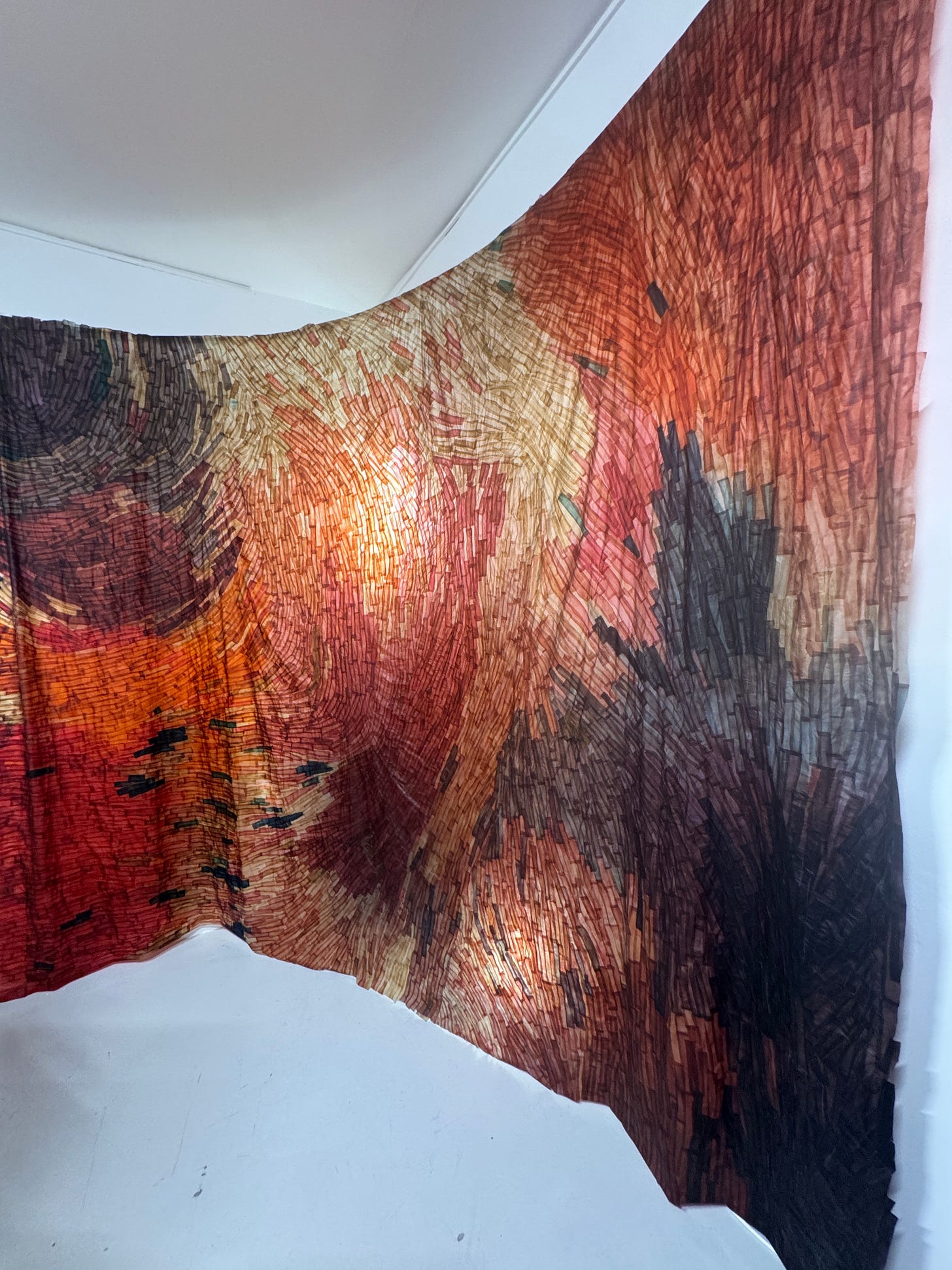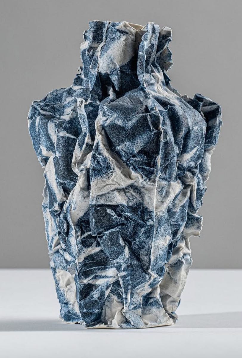 Clay + paper experiments → Another poured liquid clay into paper, let it pool and stain, then fired it in the kiln with zero idea of what would come out. The results were unpredictable—and all the better for it.