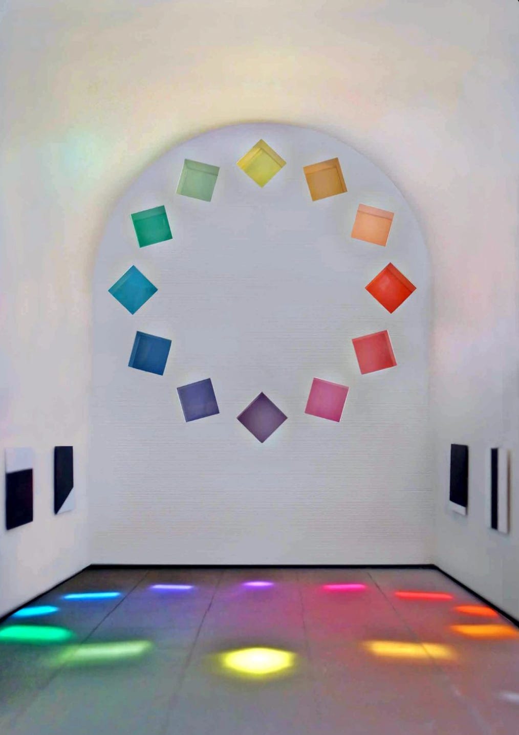 Look for pieces that play with luminosity. Think Tom Fruin, Lita Albuquerque, or contemporary works that explore warmth, glow, and color fields.